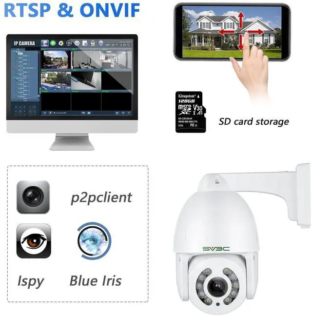 ONVIF Protocol: Transmitting data and power stability through a single Ethernet cable, POE IP cameras connect seamlessly to POE switches, NVR, especially when streaming at the maximum 5MP resolution. SV3C packages include a power adapter as a backup solution for users without POE devices. ONVIF PTZ POE cameras are compatible with various platforms including browsers, FTP server, email alert, RTSP, Camhipro app, computers, tablets, ONVIF NVR, Blue Iris, and ISPY. ^^ Super HD 5MP and 200FT