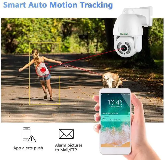 Storage: Notifications for when the ptz outdoor camera detects motion is very quick in the Camhipro app and remote access features allows you to view the live feed and know what is going on. POE security camera picks up any moment whether it be people, vehicles and Intelligent customize set human motion detection to reduce false alerts. Outdoor security camera supports 24/7 video record to SD card or NVR, no subscription fee to playback and download easily. ^^ Auto Tracking and
