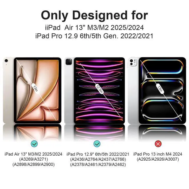 • Compatible ModelOnly Designed for iPad Air 13 Inch M3/M2 2025/2024, iPad Pro 12.9 Inch 6th/5th Gen. 2022/2021. Please verify the model number on the back of your iPad for compatibility. Note: It is Not compatible with any other devices.