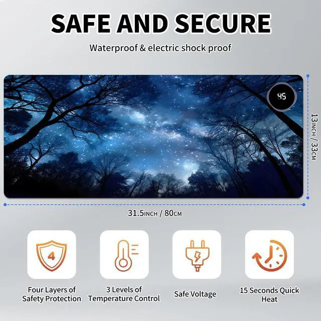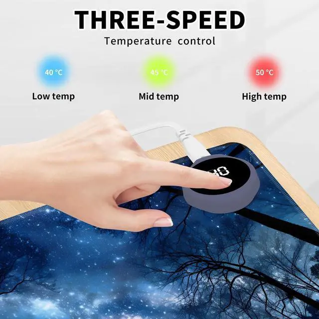 DayMulti-Functional: This warmer mouse pad also can be used as a gaming mouse mat, table warm pad, foot warmer pad, pet warmer pad. It will give you many surprises about its usage. It can keep you warmer through the cold winter. Keep warm anytime and anywhereThe heated desk mat has three temperature settings(40C, 45C, or 50C) and digital display, allowing you to customize the heat level according to your preference. The double-layer heating sheet of mouse pad enables rapid heating, just 15 seconds, you can feel significant heat. Uniform and stable heating can make your body warm anytime, anywhere in the winter.