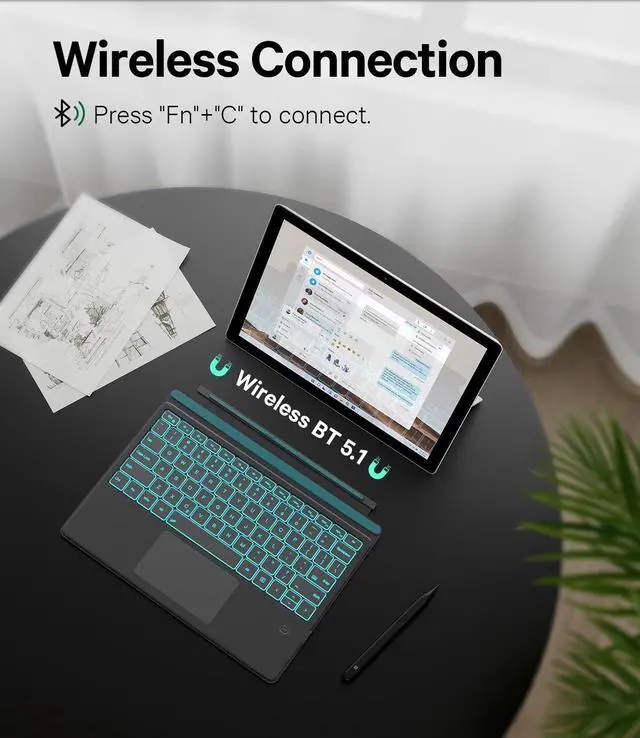 ^^ Wireless Connect: This Surface Pro 9 keyboard supports 10 meters long-distance connection. Stable 5.1 Bluetooth connection to the device, so you can use the keyboard and tablet separately. Also, the detachable design will not consume extra power from the tablet.