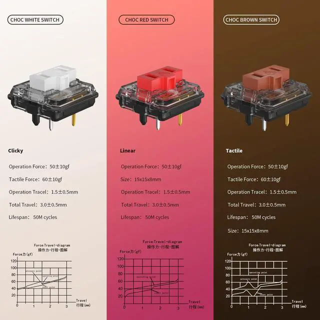 Kailh Low profile switch chocolate, Size: 15x15x8mm ^^ Operation force: 5010gf ^^ Operation travel: 1.50. 5mm ^^ Total Travel 3.0 +0/- 0.5 mm ^^ Durability-Approximate lifespan of 50 million times of keystrokes based on laboratory durability test.