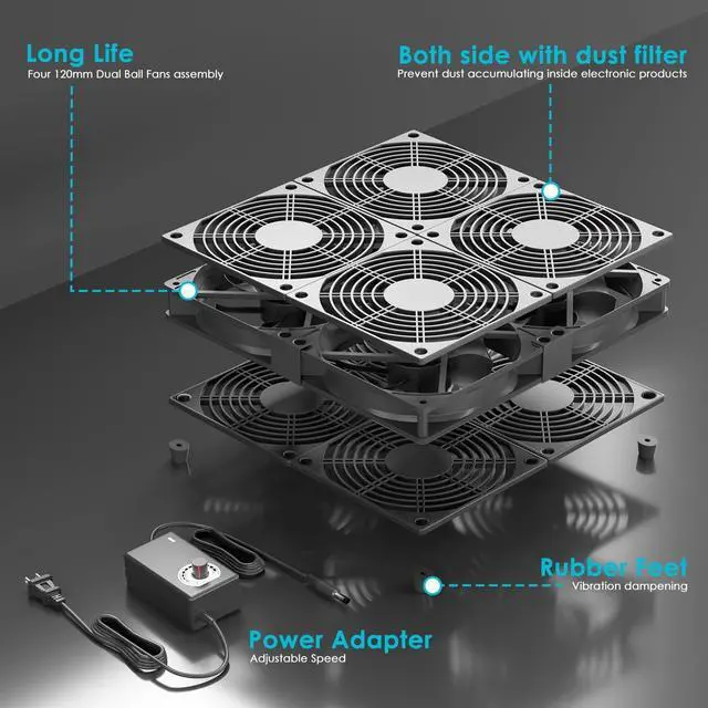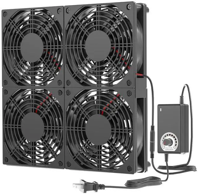 Complete Cooling Kit with Universal Power SupplyThis all-in-one package includes everything you need: 4 high-airflow 120mm fans, a wide-voltage AC/DC power adapter (100-240V AC to 12V DC), and a speed controller. The universal input voltage makes it perfect for use worldwide ^^ Adjustable Speed for Customized CoolingTake full control of your airflow and noise levels with the included PWM (or DC) speed controller. Easily adjust the fan speed from a quiet breeze to a powerful 2000 RPM wind, tailoring the cooling performance to your exact needs ^^ Durable & Reliable Ball BearingsEngineered with long-life ball bearings, these fans are built for extended operation and superior durability compared to sleeve bearings. They are ideal for continuous use in various orientations, providing consistent and reliable performance ^^ Versatile Multi-Fan ApplicationsPerfect for a wide range of DIY cooling projects. Effectively cool down computer cases, server racks, entertainment centers, 3D printer enclosures, workbenches, or any enclosed space that requires efficient airflow and heat dissipation ^^ Easy Installation & Ready to UseThe fans are designed for straightforward setup. Simply connect them to the controller and power adapter, plug into any wall outlet, and experience instant, powerful cooling. No complex wiring or internal PC power connections are required
