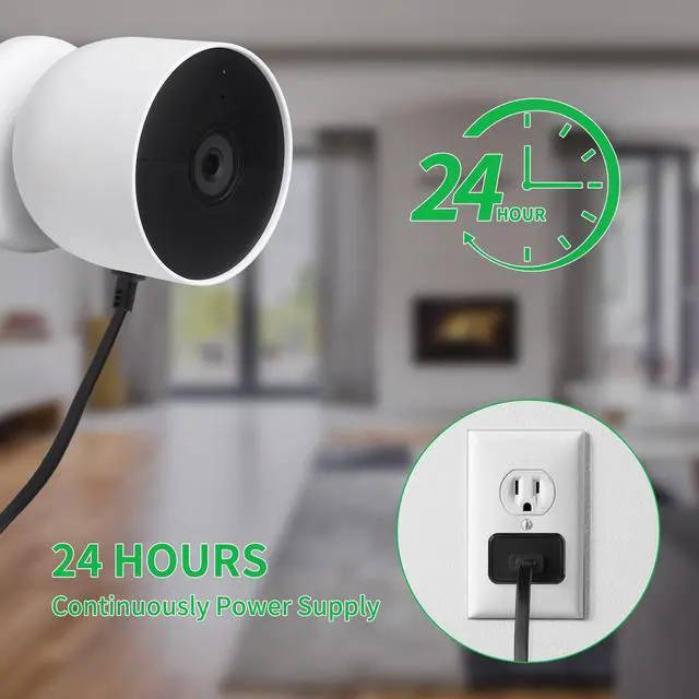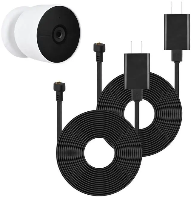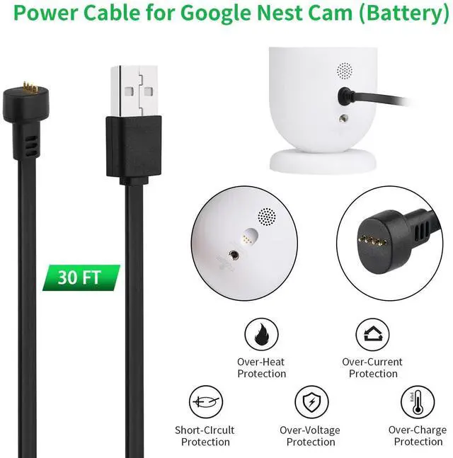 Compatibility - ONLY designed for Google Nest Cam Outdoor or Indoor, Battery - 2nd Generation, Not for nest cam outdoor 1st Generation, nest cam IQ or any other nest devices (Notes: Nest Camera is Not Included) ^^ Long Cable - 30Ft/ 9.1 m extension power cable allows you to position your camera indoor or outdoor your house without worrying the distance ^^ Waterproof Protection - With strong magnetic charging head, it fits into the camera's charging port very tightly so as to prevent rain from penetrating the charging port, ensures to charge your camera all the time ^^ Easy to use - Just plug this usb cable into your camera, then connect to your charging adapter to the outlet to work ^^ UL &FCC Certified - Built-in safeguards, provides multiple protections to effectively ensure safe charging, against over-current, over-heating, over-voltage, and short-circuit protection