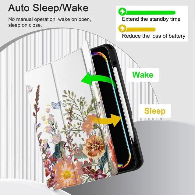 ^^ For Apple Pencil Charging Built-in Pencil holder and adapter slot, fully supports charging and pairing with Apple Pencil Pro and Pencil USB-C. Easily grab your Pencil or adapter whenever you need perfect for carrying both your iPad and Pencil together. (Case only, other accessories not included. ) ^^ Professional Design Inner honeycomb grid air-cushion pattern helps dissipate heat efficiently, improving shock absorption and extending iPad lifespan. The multi-layer painting process gives a sleek, refined look that resists fingerprints and daily wear. ^^ Convenient Function Features sensitive Auto Wake/Sleep function for power saving.