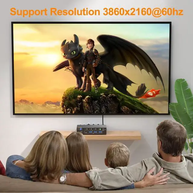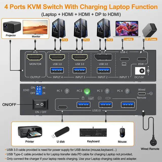 4 Computers share 1 monitors USB-C KVM Switch control 4 computers with 1 monitors via DP+HDMI+USB-C matrix. Share 4 USB 3.0 devices (keyboard/mouse/printer/camera) in one hub Switch Slash desktop clutter while boosting multitasking efficiency by 30%. ^^ Support High Resolution and High Refresh Rate4 Computers 1 monitor KVM Switch supports up to 4K@60Hz. Use 8K DP 1.4, USB 3.1 Gen2 and HDMI 2.1 cables for a better experience, shorter cables are better when distance allow. ^^ Equipped with a dedicated 2K/4K resolution switchthis KVM enables one-click output adjustment, supporting smooth switching between 2K (25601440) and 4K (38402160) resolutions to perfectly match your 2K gaming monitor or 4K ultra-HD office display.