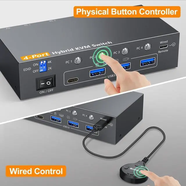 You can also optimize display performance flexibly based on your needs: switch to 2K mode for high-refresh-rate gaming or fast-paced graphic design tasks, or toggle to 4K mode for crystal-clear video conferencing, photo editing, and movie streaming. ^^ Effortless Multitasking & Clutter-Free SetupStop wasting time swapping cables! This USB-C KVM switch lets you manage multiple devices from 1 central hub no more unplugging and replugging. Ideal for busy work desks, tech setups, or home entertainment centers. ^^ 2 Display Modes for