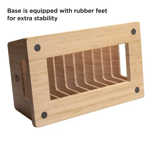[Multi-Device Organization] Featuring ten 1.25 -inch wide slots, this bamboo organizer provides ample space to neatly arrange and store a variety of devices, including smartphones, tablets, slim laptops, e-readers, and even thin books or small 3-ring binders, keeping your tech and reading materials in one accessible place. ^^ [Sustainable Bamboo Construction with Secure Base] Crafted from beautiful and durable bamboo, this stand not only offers a stylish and eco-friendly storage solution but also ensures the safety of your valuable gadgets. Four non-slip rubber feet on the bottom provide exceptional stability and protect your desk or countertop from scratches and unwanted sliding.