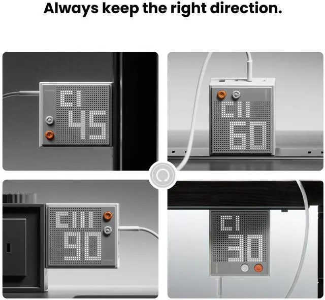 Smart Interactive Display: Equipped with a unique adjustable dot-matrix screen. It displays real-time wattage for each port, and you can customize both the brightness and orientation to suit your needs. Whether you're using it on your desktop or taking it on the go, monitor the charging status of your devices at a glance. Stay informed and in control of your charging setup effortlessly ^^ Charge 4 Devices at