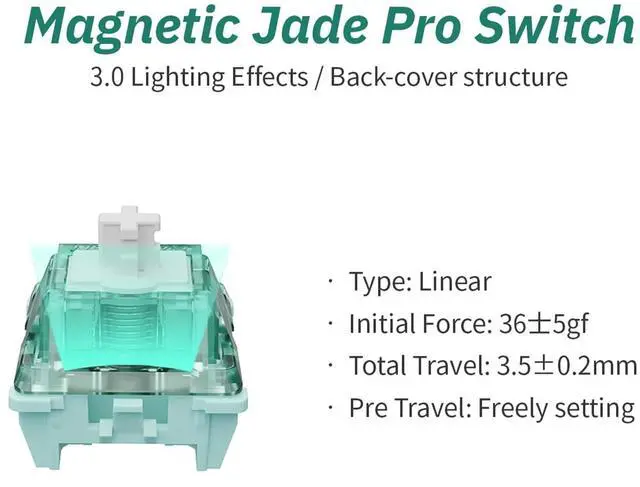 [Keyboard Switches] GATERON Magnetic Jade Pro Keyboard Switches Adopts Rare Earth Permanent Magnet MaterialsIncorporates Special Precious Metal Casting, Featuring Strong Magnetic Remanence. ^^ [Intro] This GATERON Magnetic Jade Pro Keyboard Switch is a black technology. A contactless magnet switch powered by Effect Hall sensors. 20mm Longer Spring, faster rebound and better typing feel. Full Magnetic Power Dive into the Future of Fun, New Design, New Upgrade, New Experience. ^^ [Capability] Its simple construction and quality build assures a frictionless linear press. Theres no bump, rub, or scratch.