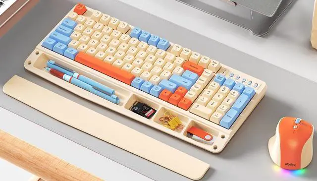MULTI-DEVICE CONNECTIONThe C4000 Colorful Keyboard and Mouse offers two connectivity options, including BT 5.2 and 2.4GH z wireless modes. It can connect up to three devices at the same time and can be easily switched with the three mode keys. Connectivity is unlimited for work, play and study. ^^ CONVENIENT STORAGE IN PALM RESTThe one-piece palm rest ensures stability during use. Whether you're rapidly tapping the keyboard or gently pressing keys, the palm rest consistently provides support. The palm rest has built-in storage space, an innovative design that allows you to conveniently store frequently used office items and keep your desktop tidy and organized.