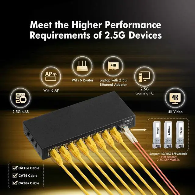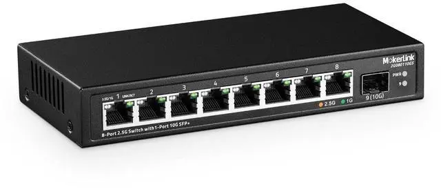 Ports: The network switch has 8 x 2.5G igabit Ethernet Ports, compliant IEEE 802.3 bz ( 2.5G ) standard, support 10/100/1000M/ 2.5G adaptive. 1 x 10G SFP+ Port(compatible 1G/ 2.5G Module, not include SFP Module). 60Gbps backplane bandwidth, excellent data forwarding performance ^^ Easy to