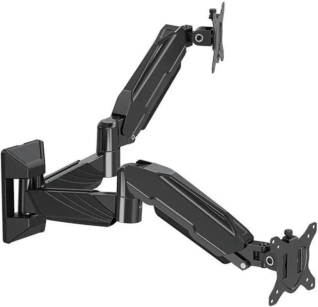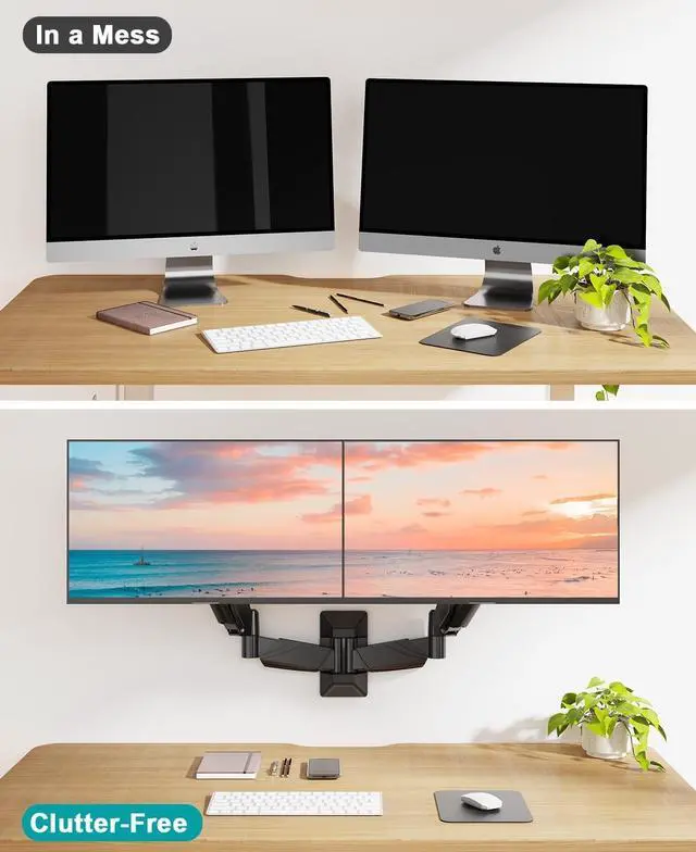 It can tilt up to -90 or +90 to minimize screen glare and rotate 360 to switch between portrait or landscape orientations. Additionally, the horizontal orientation features a swivel 180 adjustment function that allows you to view the screen from different seat positions. ^^ Optimize Space - Mounting your monitors on our wall-mounted dual monitor arm frees up desk space, creating a cleaner and more organized workspace. It also allows for easy task-switching and collaboration with colleagues, fostering a more flexible and dynamic work environment. Furthermore, our dual wall monitor mount also includes cable management, eliminating the worry of messy wires.