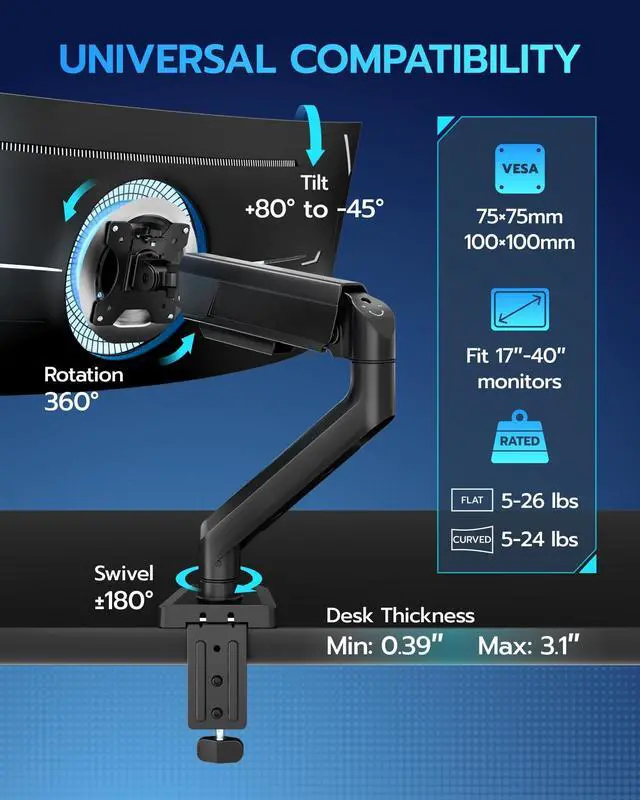 ., making this, monitor stand ready for use in minutes. ^^ Ergonomic Viewing AnglesCustomize your setup with 17.63" height adjustment, 18.4" extension range, 180 swivel, 360 rotation, and -45/+80 tilt. Achieve eye-level alignment effortlessly. ^^ C-Clamp & Grommet BaseIt features full VESA compatibility (75x75, 100x100) and offers two versatile installation options C-Clamp ( 0.39" - 3.3" thick desks) or Grommet Mount ( 0.5" - 1.8" thick desks).