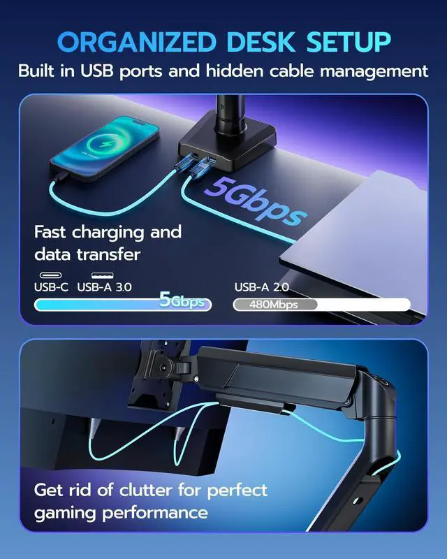 Durability and StrengthAres Wing Monitor Mount supports up to 26.4 lbs and fits max 40-inch ultrawide curved screen displays, ideal for gaming setup and office workstation. Its internal mechanical spring undergoes 25, 000+ fatigue tests, ensuring long-lasting stability for heavy-duty use. ^^ Integrated USB A/CMaximize desk space with built-in USB 3.0 ports and cable management effortless charging of your smartphones, game equipment and data transfer. Transforming your area into an organized gaming space. ^^ Quick InstallationThe quick-release VESA plate for simple monitor installation. Effortless setup via "Fix Base Attach Arm Mount Monitor" steps.