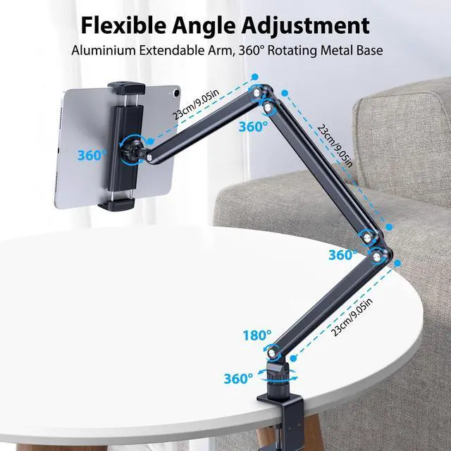 ^^ Flexible Extending Arm: The tablet desk mount is constructed with 3 sections extendable long arm, which can be extended and retracted to a larger space for use. It can meet the needs of various angles and positions. Its perfect for watching movies, playing games, reading, or following recipes, giving you the flexibility you need.