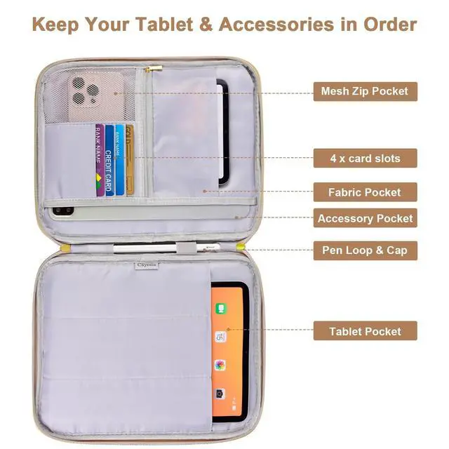 It fits most 9-11 inch tablets/iPad/iPad Pro/iPad Air, Not recommended for tablets with thick case/keyboard case ^^ Portfolio style design, for 9-11 inch tablets & iPad accessories ^^ Front pocket with raised corner design helps get you much more accessories storage space ^^ Puffy padded exterior nylon material prevents your digital items from accident spill ^^ Its portable & lightweight, can be easily hand-held or slide into backpack