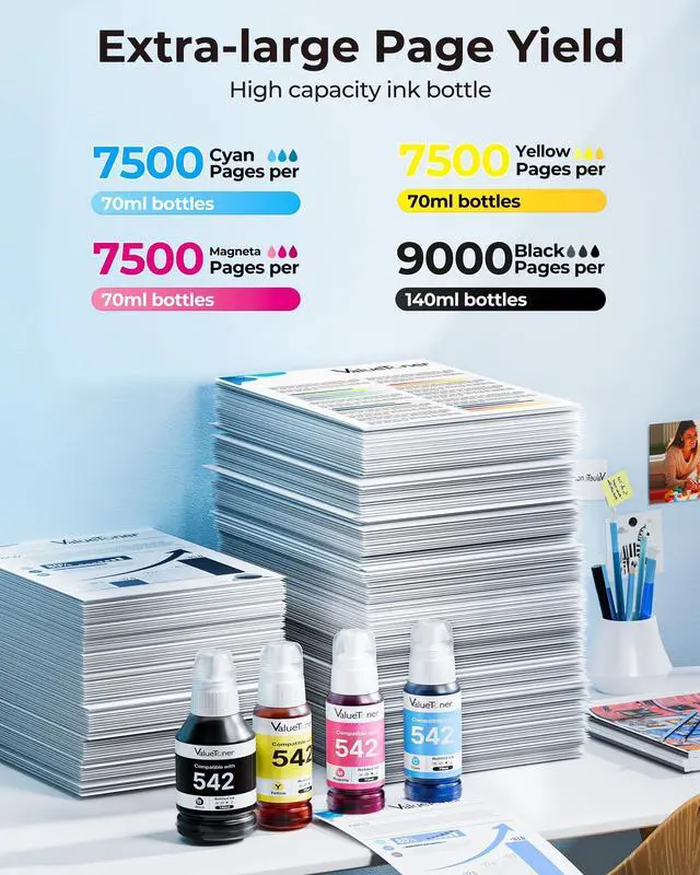 ^^ Extra-large Page Yield: High capacity ink bottle, 1 bottles of 140ml black ink can totally print 7, 500 pages, 7, 500 pages per black 542 t542 ink black, & 6, 000 pages per 542 color ink cartridges, 3 bottles of 70ml color ink.