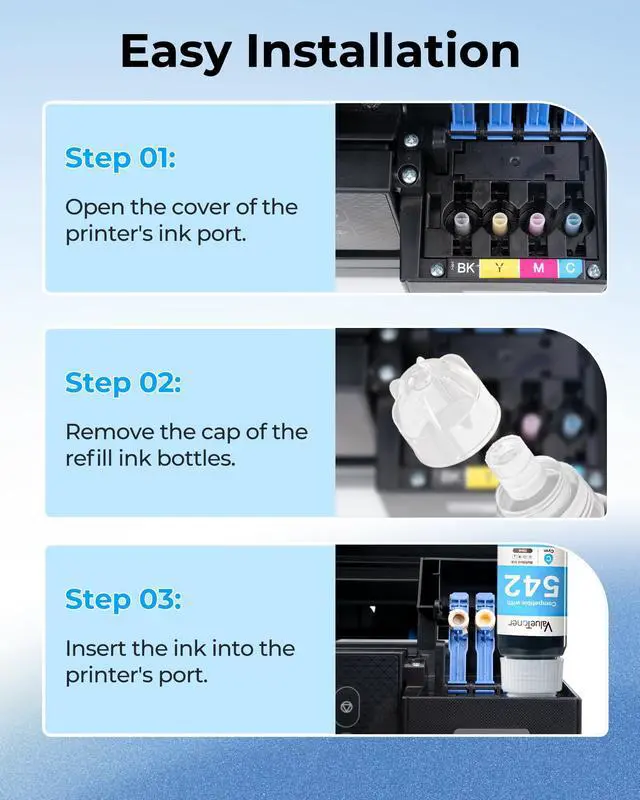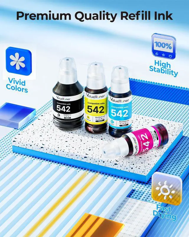 Auto Stop Bottles: The t542 542 ink bottle is auto-stop designed, no spill, easy fill, and fast drying. High compatible with your Ecotank&Supertank printers easily, This works as the OEM does.