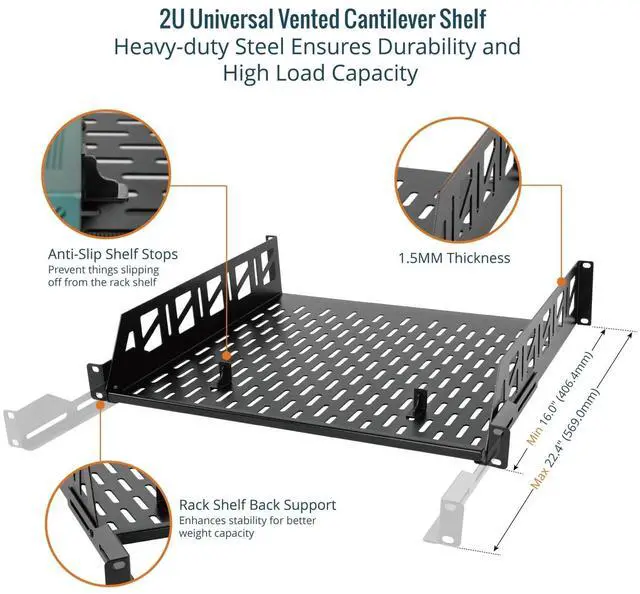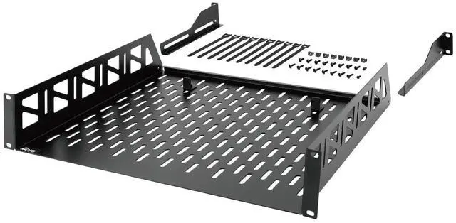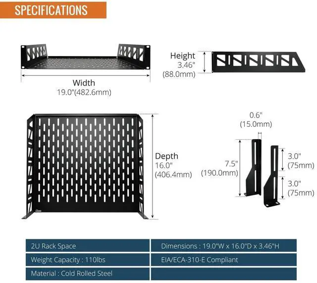 Sturdy: 19"W x 16"D x 3.46"H, this 2U shelf is made from 1.5MM thickness cold rolled steel; Electrostatic powder coat preventing rust and corrosion; Reliable and durable ^^