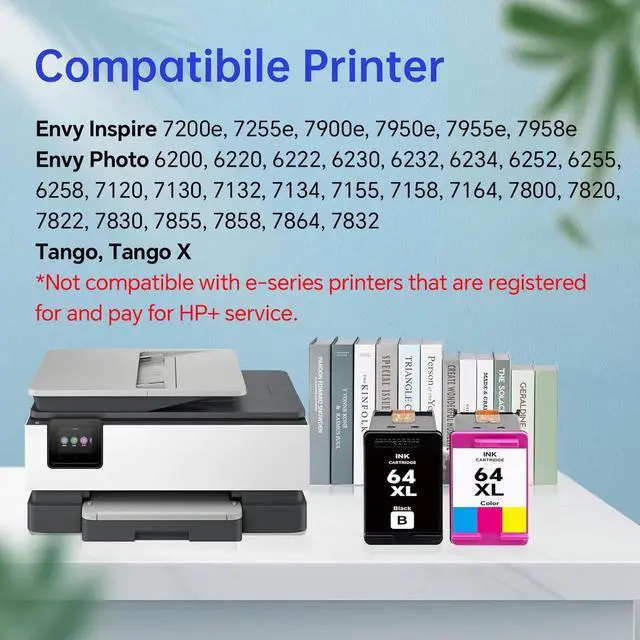 Compatible Printer Models: 64XL Black and Color Ink Cartridges compatible with HP ENXY Inspire 7200e, 7255e, 7900e, 7950e, 7955e, 7958e; ENVY Photo 6200, 6220, 6222, 6230, 6232, 6234, 6252, 6255, 6258, 7120, 7130, 7132, 7134, 7155, 7158, 7164, 7800, 7820, 7822, 7830, 7855, 7858, 7864, 7832; Tango, Tango X. (*Not compatible with e-series printers that are registered for and pay for HP+ service. ) ^^
