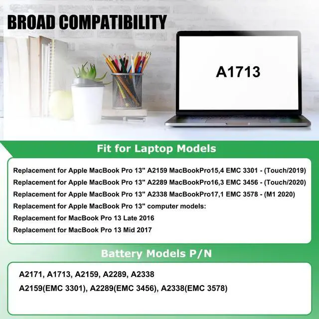 COMPATIBLE LAPTOP MODELS: Replacement for MacBook Pro 13-inch model A1708 (Late 2016, Mid 2017 year) version MLL42 MLL42LL/A MPXQ2 MPXQ2LL/A MLUQ2 MLUQ2LL/A MPXR2 MPXR2LL/A MPXU2 MPXU2LL/A MPXT2 MPXT2LL/A MacBook Pro13, 1 MacBook Pro14, 1 Series ^^