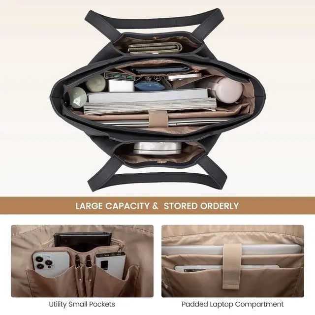 Function Combined: This women's shoulder work tote is tailored for the woman unwilling to sacrifice either. This uniquely styled laptop bag is the ideal choice for work, business trips, meetings, and college classes. ^^ Spacious & Practical Design Measuring 15 x 5.5 x 12 inches, this womens tote bag features a roomy main compartment, a padded 15.6 -inch laptop pocket, two slip pockets, and a zippered pocket. Its perfect for iPad, papers, files, headphones, and more, ensuring your essentials are organized and accessible.