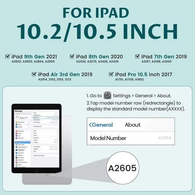 For iPad 9th Generation Case with KeyboardCompatible Keyboard Case for iPad 9th Generation - A2602, A2603, A2604, A2605; Keyboard Case for iPad 8th Generation - A2430, A2270, A2428, A2429; Keyboard Case for iPad 7th Generation - A2197, A2198, A2200; iPad Pro 10.5 inch case with keyboard 2017 - A1701, A1709, A1852; iPad Air 3rd Generation - A2123, A2152, A2153, A2154