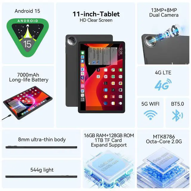 2026 LATEST ANDROID 15 TABLET OCTA-CORE PROCESSORFEONAL 11 inch Android tablet, powered by the newest Android 15 operating system (with GMS certification) for 2026. It features a high-speed MTK8786 Octa-Core Processor and the latest UI interface, delivering a smoother, faster, and more efficient user experience, along with enhanced privacy and data control. Apps can be easily managed across multiple screens, offering a professional-grade experience whether youre working or playing. It has everything you need for all your tasks and entertainment. ^^ LARGE STORAGE AT YOUR FINGERTIPSThe Android 15 tablet features 16GB of RAM (8GB physical + 8GB virtual) and 128GB of internal storage, with support for up to 1TB of expandable storage (TF card not included).
