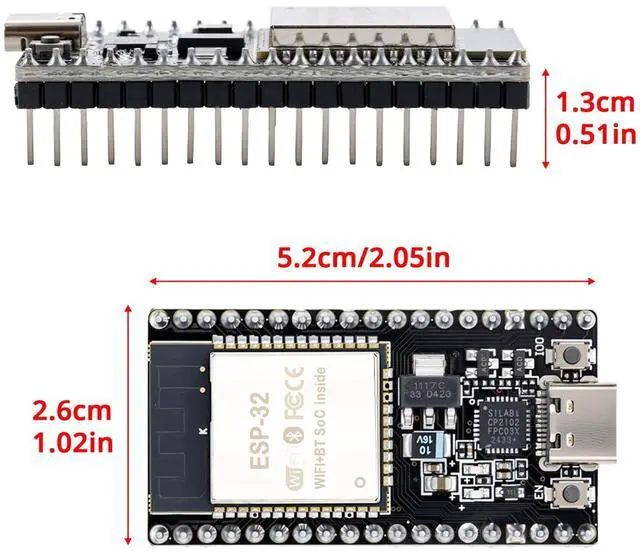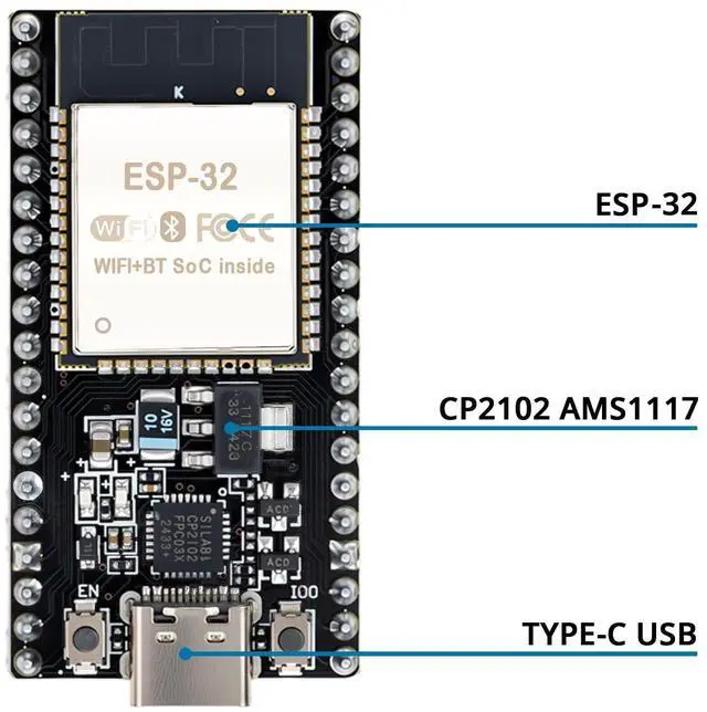 ESP32 CP2012 USB C (Type-C) core board, equipped with 38 pins, offering more functions compared to 30-pin modules. Its narrower width enables excellent connection to the breadboard. ^^ Integrated Components ESP32 integrates antenna, switch, RF balun, power amplifier, low noise amplifier, filter, and power management module. ^^ Supported Interfaces Supports multiple interfaces, such as UART/SPI/I2C/PWM/DAC/ADC, providing versatility for various applications. ^^ Wireless Capabilities Features 2.4GH z WiFi and Bluetooth dual-mode, with support for STA/AP/STA + AP modes and common AT commands, ensuring convenient usage.