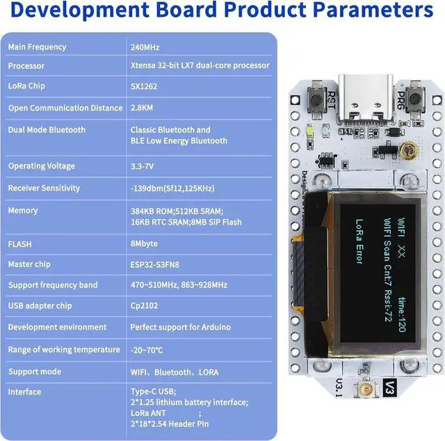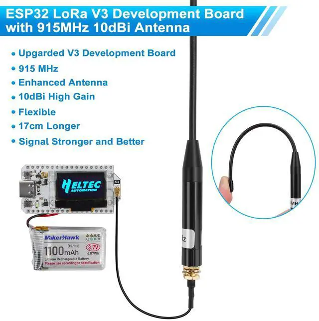 ^^ Enhanced Connectivity: Equipped with LoRa, WiFi, and Bluetooth capabilities, this development board provides versatile connectivity options. The integrated 915MHz antenna, paired with a high-gain design (10dBi), ensures long-range communication, making it perfect for your mesh networking and tracking applications.