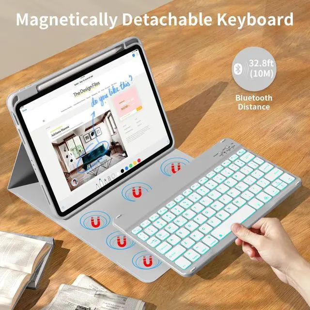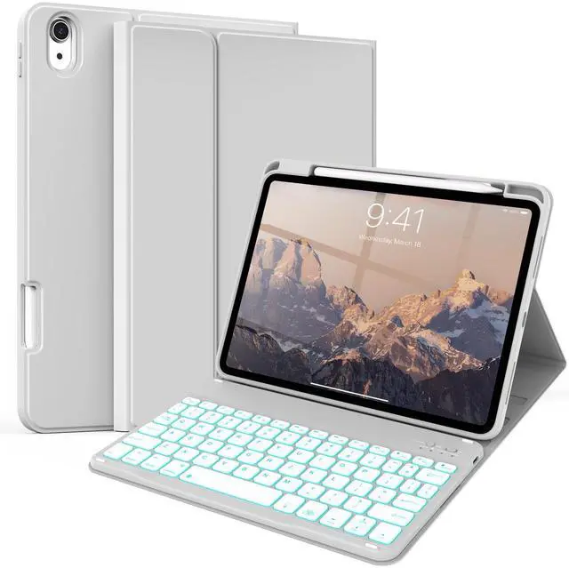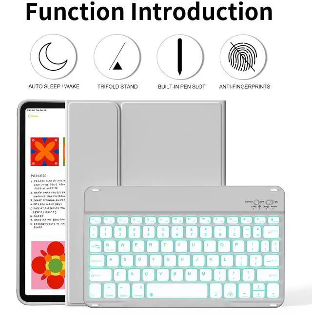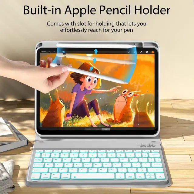 The protective shell can be placed at different tilt angles to adjust the optimal viewing angle, very flexible and user-friendly. ^^ Buit-in Pencil Slot & Sturdy PU MaterialThe ipad 11/10th generation keyboard case has a convenient right side built-in pencil slot that easy to storage and remove your pencil (Apple Pencil is Not included). Premium PU leather cover is waterproof, scratch proof and fingerprint proof, providing full protection for your beloved tablet. ^^ Practical 7-Color Backlight KeyboardThis keyboard has 7 LED backlight colorssingle color/breathing lightand 3 brightness options. The square keycaps are very classic and personalized.