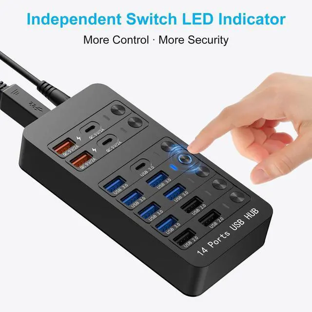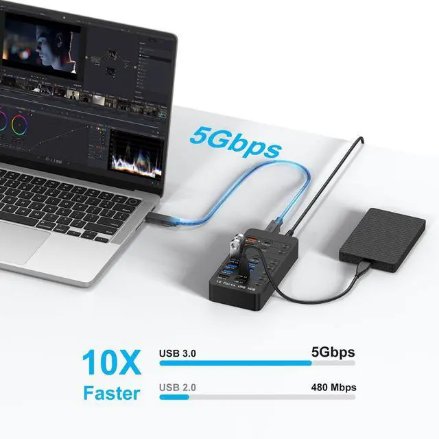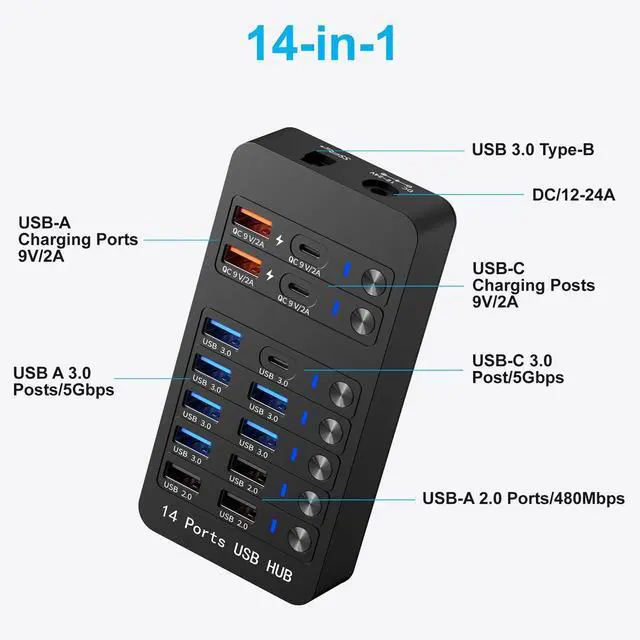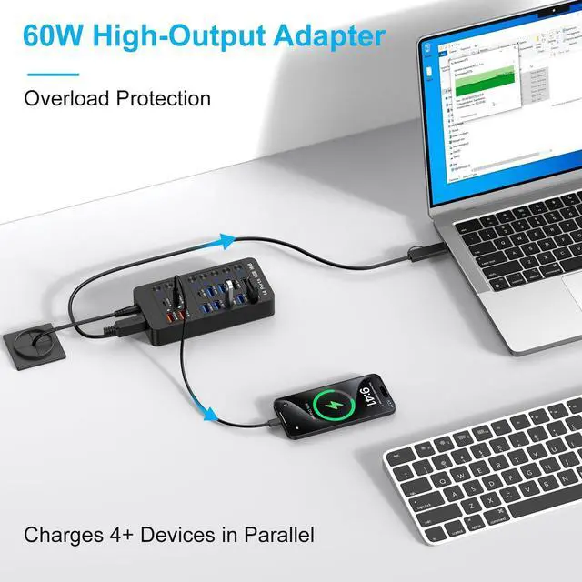 Versatility: Expand connectivity with 6USB 3.0 (5Gbps), 3USB 2.0, 2USB-A Fast Charging (9V/2A), 2USB-C Fast Charging (9V/2A), plus 1USB-C 3.0 and 1USB 3.0 Type-B ports. Charge phones, transfer files, and connect peripherals (cameras, printers, drives) simultaneously. ^^ 60W Fast