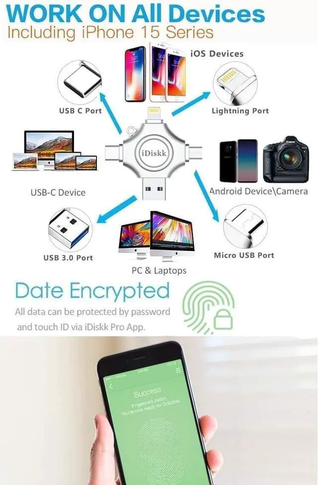 *Tip: Simply download the iDiskk Player app from the App Store to get started. ^^ Automatic In-App Backup for Photos & VideosCapture lifes moments directly through the dedicated app and choose to have your photos and videos saved automatically to the flash drive in real time. Forget about manual transfersfree up your phones internal storage effortlessly while ensuring every memory is safely stored and ready to access. ^^ Broad File Format Support & Direct PlaybackStore and play a wide variety of file types without conversion. This drive supports mainstream video formats (MP4, MOV, MKV, AVI), audio files (MP3, FLAC, M4A), and documents (PDF, Word), making it perfect for work, travel, or everyday entertainmentall accessible anytime, anywhere. ^^ Advanced Privacy with File EncryptionTake control of your privacy with built-in Touch ID and passcode encryption. You can choose to protect the entire drive or lock specific sensitive files, giving you peace of mind that your personal data stays secure while enjoying the convenience of portable storage. ^^ Dedicated Customer Support Were Here to HelpShould you have any questions or encounter an issue, our customer support team is available 24/7 via email or Messages.