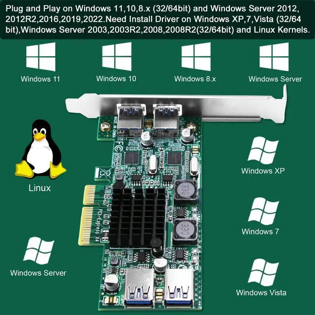 Compatible System: 1. Plug and Play on Windows 11, 10, 8. x (32/64bit) and Windows Server 2012, 2012R2, 2016, 2019, 2022 systems. 2. Need to Install Driver on Windows XP, Vista, 7 (32/64bit) and Windows Server 2003, 2003R2, 2008, 2008R2 (32/64bit) systems. 3. Plug and Play on most Linux kernels. 4. Support Plug and Play on MAC OS X. ^^ 5. PCIE X4 interface design, will works on PCIE X4, X8, X16 slot. Do not work on PCIE X1, X2 slot, do not work on PCI slot. Based on PCIE 2.0 standard, will compatible with PCIE 1. x, 2. x, 3. x, 4. x PCIE slot. The full height bracket mounted on this PCIE USB 3.0 expansion card, will works on Standard Size PCs. Low profile bracket in the package, will works on Slim PCs. ^^ 6.
