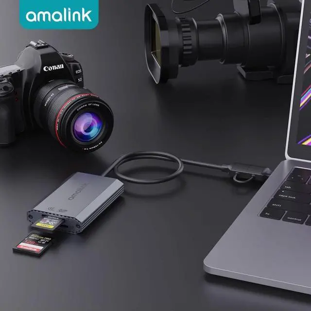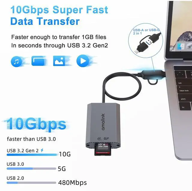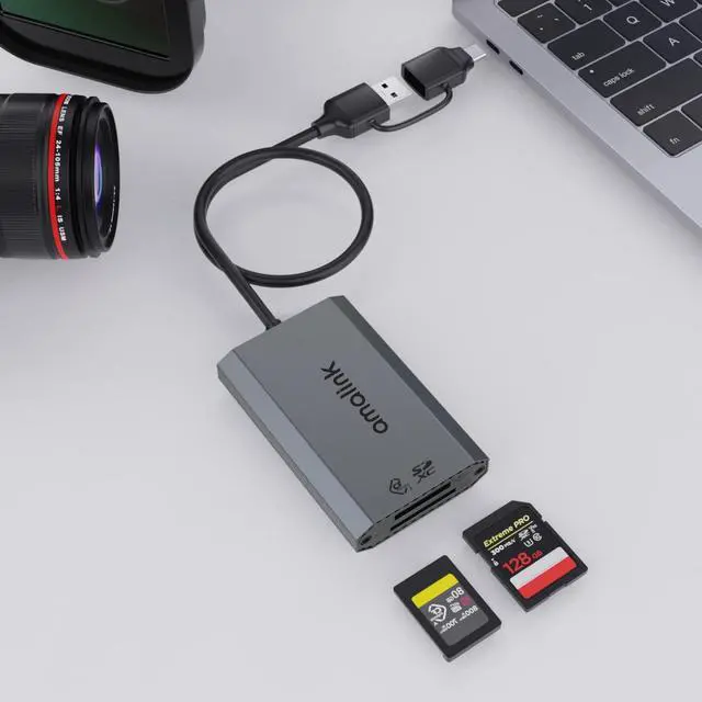 ^^ Hybrid 2-in-1 interfaceUSB 3.0 USB-C CFexpress Reader. This card reader has an exclusive dual connector design, with both USB A and USB C ports. Designed to allow this CFexpress cards reader to compatible with all variety MacBook Pro, Mac Air, computer, PC, laptop USB C smartphones and other type-c devices simultaneously. Help you easily share stunning moment with friends and family anywhere, anytime with Ultra Speed USB 3.2 (USB 3.1 Gen 2) 10Gbps data transmission. ^^ Superior CompatibilityThis Multi CFexpress/SD Card Readers strongly compatible with CFexpress and SD cards, supports variety capacity like 32GB, 64GB, 120GB, 128GB, 240GB, 256GB, maximum capacity up to 2TB.