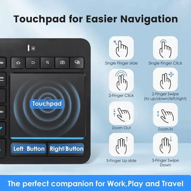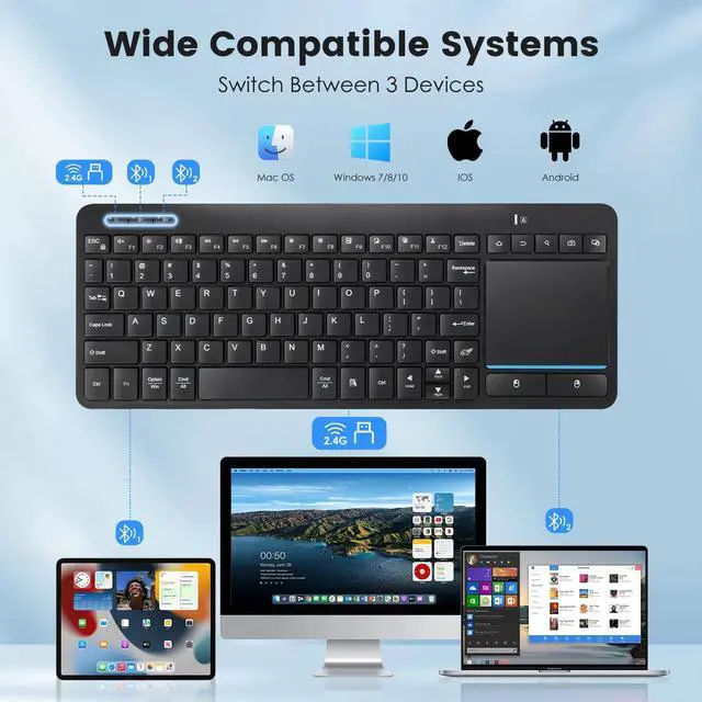 3 Devices Connection This Bluetooth keyboard with touchpad ensures a stable and cable-free connection, Wireless 2.4 GHz connection with 33 feet (10m) operating range. Easily switch between 3 devices, You can switch between 3 devices with a single key clicking without any interference or disconnection, greatly upgrade your work efficiency. ^^ TWO-IN-ONE KeyboardThe wireless keyboard touchpad is a multi-use keyboard that can work with your laptops, phones, tablets, computers. Features a multi-touch trackpad to provide effortless navigation. Available gestures to achieve pointing, zooming and scrolling function. Give you an integrated and cozy control of your daily office work and HTPC entertainment, and record your inspiration anytime.