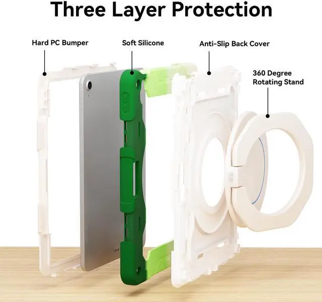 Three-layer Protective Structure: The three-layer structure of this ipad air 13 inch case provides comprehensive protection for your device. The outer layer is made of silicone, offering a soft, non-slip grip that not only enhances comfort during use but also helps prevent accidental drops. Beneath the silicone layer, the hard plastic back shell adds a robust defense against impacts and scratches, also features a shock-absorbing bumper that encircles the edges of the tablet, these three layers work in harmony to shield your tablet from damage while maintaining a sleek and functional design ^^