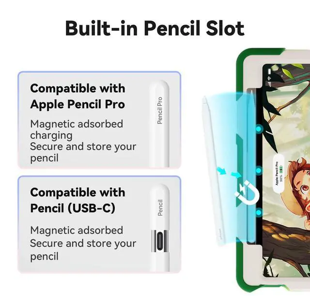 Built-in Pencil Holder: Built-in pencil slot for easy storage of your pencil, keeping it within reach and preventing misplacement. It also supports magnetic charging for pencil pro, allowing for effortless recharging while attached to your tablet. Enjoy seamless creativity without the worry of losing your pen or running out of battery