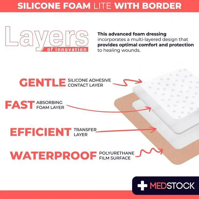 ^^ Waterproof Shield: Stand strong against the elements. Medstock Silicone Foam Lite Dressing with Border is equipped with a protective barrier, serving as a formidable shield against water and bacterial infiltration. No more worries about dampness interfering with your recovery. With this dressing, your wounds stay pristine, dry, and safe, promoting an optimal environment for healing.