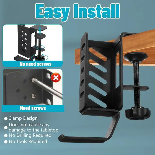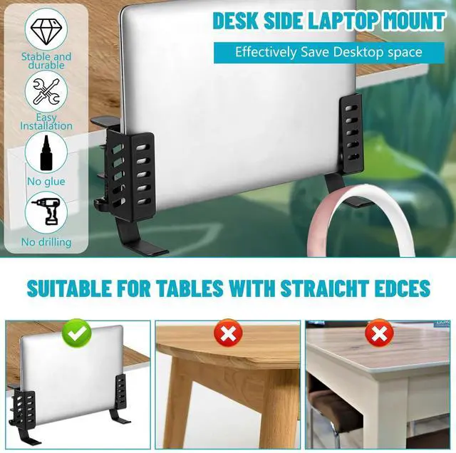No Drill Desk Side Laptop MountEffectively Save Desktop SpaceThis desk side hanging organizer can be retrofitted to the side of a desk to easily hold a laptop, tablet, Notebooks, Keyboards, Headphone, gamepad, Backpack, and other items. Multifunctional Desk Side Storage OrganizerHigh Quality Steel MaterialNo Drilling & Easy to InstallMaximize Desktop Space