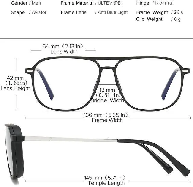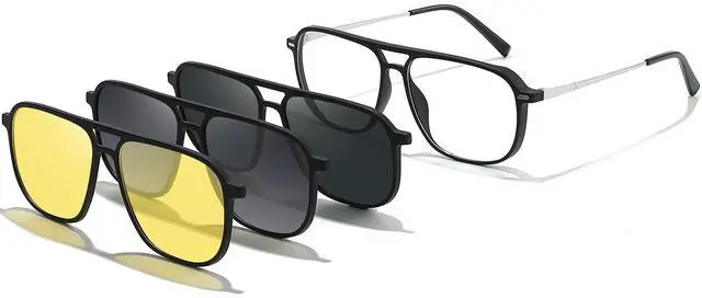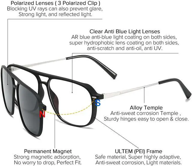 Both sides of the lens are coated with super hydrophobic coating, which is scratch-proof and oil-proof and easy to clean. The lens is made of PC, the lens is not easy to break. ^^ ULTEM frame is made of ultra-light ULTEM, which is light, flexible, not easy to deform, and crashworthy wear resistance. UNIEOWFA has always been committed to providing glasses users with a more comfortable wearing experience. ^^ 3Pcs Polarized Magnetic ClipThe black and gradient gray polarized clips are used under different intensities of sunlight during the day, and the yellow clip is used for driving.