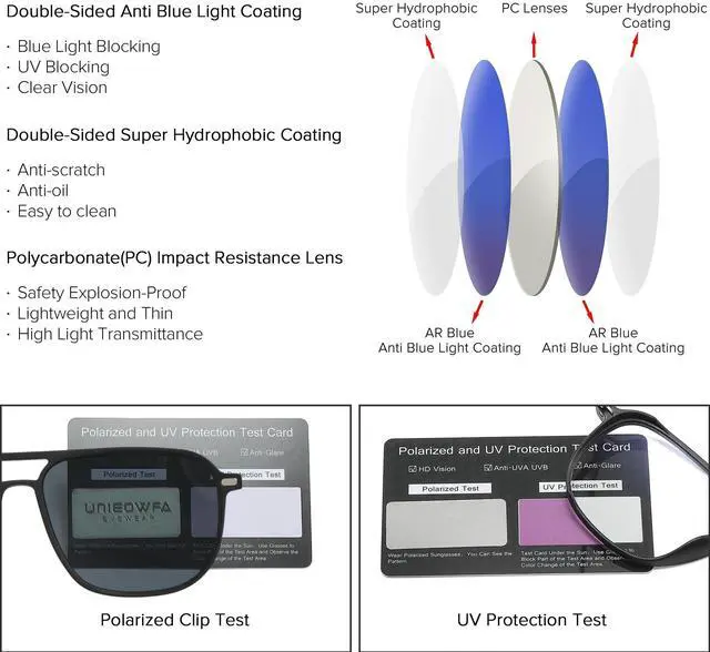Multifunctional Glasses DesignThe magnetic clip on sunglasses is very convenient to wear. The magnets on both sides of the clip will automatically adsorption the frame together when approaching. When you are using a computer and phone, it is anti blue light glasses. When you are outside in the sunlight, put on the polarised clip, it's sunglasses. If you are driving, put on yellow clip, it's driving glasses. ^^ Super Hydrophobic Anti Blue Light LensesUNIEOWFA blue light blocking glasses lenses adopt AR double-sided blue light anti-radiation film and anti-reflective film, which can absorb blue light between 380nm and 450nm, and also have UV protection function.