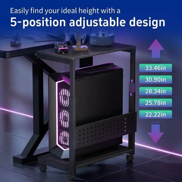 • Adjustable Height PC Tower Stand: This PC stand is designed for floor use and features 5 manual height adjustment positions ranging from 23.2" to 33.5". It accelerates heat dissipation, enhances overall computer performance, and allows flexible placement of the tower case under or beside the desk. Overall dimensions are 23.6 inches in length and 13.7 inches in width. It supports most computer cases on the market, including ATX cases