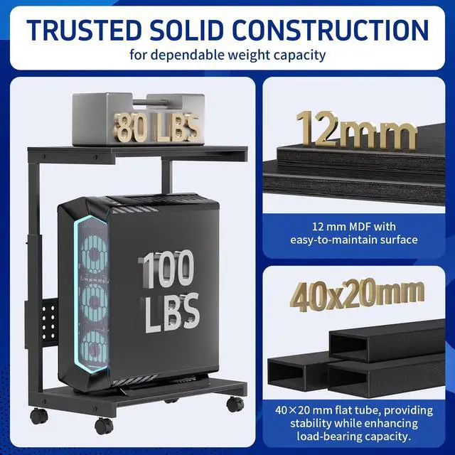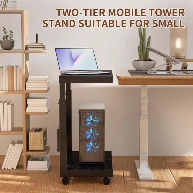 Two-Tier Design: The computer tower cart adopts an efficient two-tier design. The bottom shelf is for storing the PC tower, while the top shelf can hold a printer, plants, files, and books. The Pegboard on the back is for organizing office supplies like power strips ^^ Mobile and