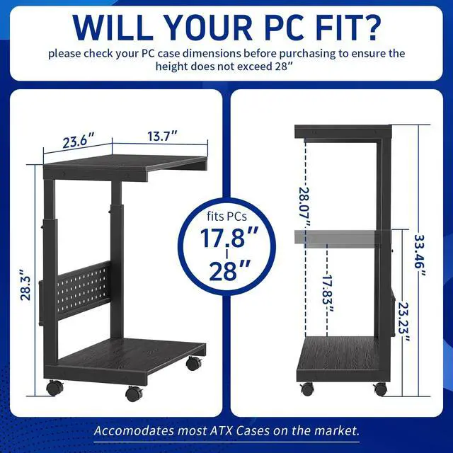 Adjustable Height PC Tower Stand: This PC stand is designed for floor use and features 5 manual height adjustment positions ranging from 23.2" to 33.5". It accelerates heat dissipation, enhances overall computer performance, and allows flexible placement of the tower case under or beside the desk. Overall dimensions are 23.6 inches in length and 13.7 inches in width. It supports most computer cases on the market, including ATX cases ^^ Multifunctional Computer
