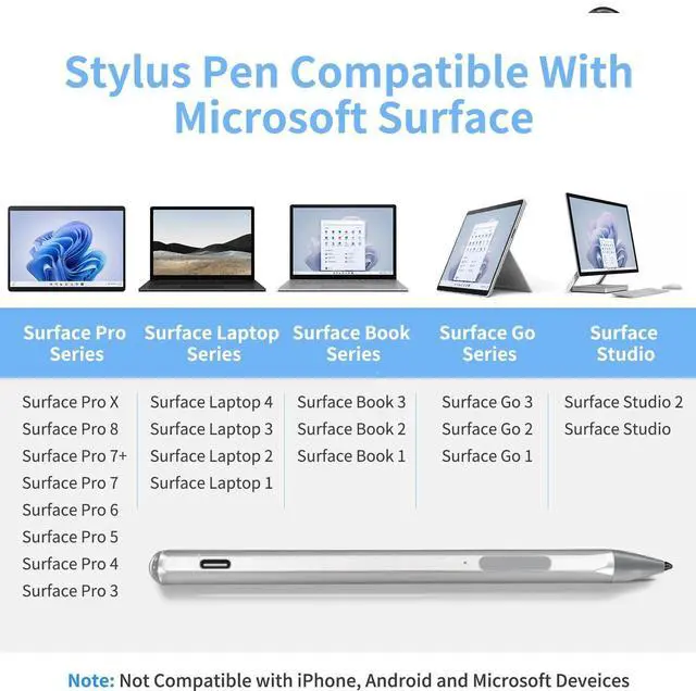 • Compatible ModelsThis stylus compatible with Microsoft Surface Pro X/Pro 9/Pro 8/Pro 7+/Pro 7/Pro 6/Pro (5th Gen)/Pro 4/Pro 3, Surface Book/Book 2/Book 3/Book 4, Surface Go/Go 2/Go 3, Surface Laptop/Laptop 2/Laptop 3/Laptop 4/Laptop Studio, Surface Studio/Studio 2 and Surface 3.
