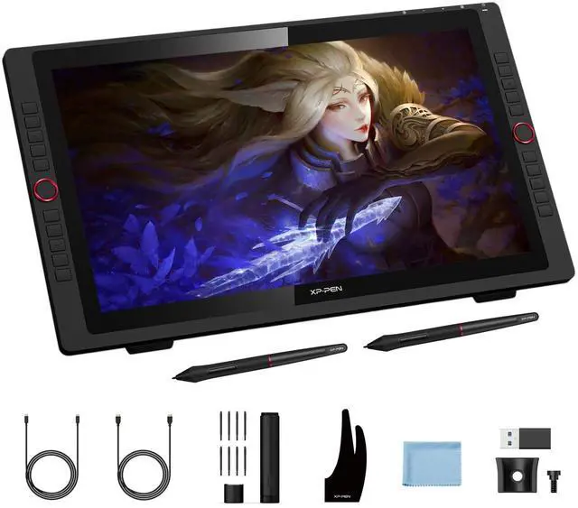 What You Get: 1 x XPPen 23.8 Drawing Display, 2 x Battery-Free Stylus, 1 x USB-A to USB-C adapater, 1 x USB-C to USB-C Cable, 1 x HDMI Cable, 1 x Power Adapter, 1 x Power Cord, 1 x Pen Holder, 8 x Replacement Pen Nibs, 1 x Quick Guide, 1 x Cleaning Cloth, 1 x Black Drawing Glove, 1 x Pen Slot ^^