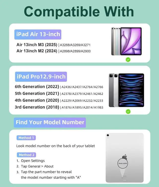 • Compatibility: This keyboard case compatible with iPad Air 13 inch (M3) 2025 (Model: A3268, A3269, A3271), Air 13 inch (M2) 2024 (Model: A2898, A2899, A2900). Compatible with iPad Pro 12.9 inch 6th Generation 2022 (Model: A2436, A2437, A2764, A2766), 5th Generation 2021 (Model: A2378, A2379, A2461, A2462), 4th Generation 2020 (Model: A2229, A2069, A2232, A2233) and 3rd Generation 2018 (Model: A1876, A1895, A2014, A1983). Please check the model number starting with "A" on the back of your tablet before purchasing