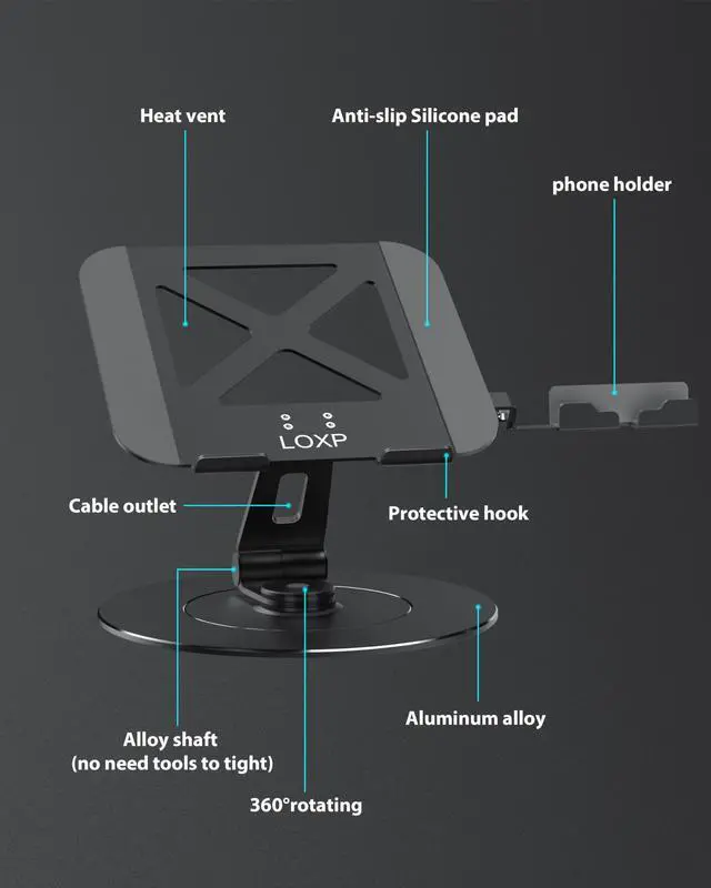 Sustainably: LOXP insists on taking experience as the beginning of design, constantly introducing safe, reliable and stable concepts, adhering to the company's concept, and our expert team is always by your side ^^ Foldable Phone Holder - All wrapped in silicone, fold away when not in use. Never worry about losing your phone again with LOXP aluminum laptop stand for desk. ^^ Fashion base - LOXP aluminum adjustable laptop stand for desk is both elegant and durablefeaturing a 300% larger base with an 11.02" diameter and a stylish CNC-carved design. ^^ What You Get - LOXP NH-01 Laptop stand, user manual, and our friendly customer service. ^^ SPACE SAVING & EASY TO CARRY: Portable laptop stand. The all-in-one foldable laptop stand is very convenient to carry. You can put it in your backpack or suitcase and take it to the office, coffee shop or even anywhere you travel. Accompany you in giving wonderful speeches in the conference room, improve your work experience, and keep your desk tidy. So much so that you can use this folding laptop stand anywhere.